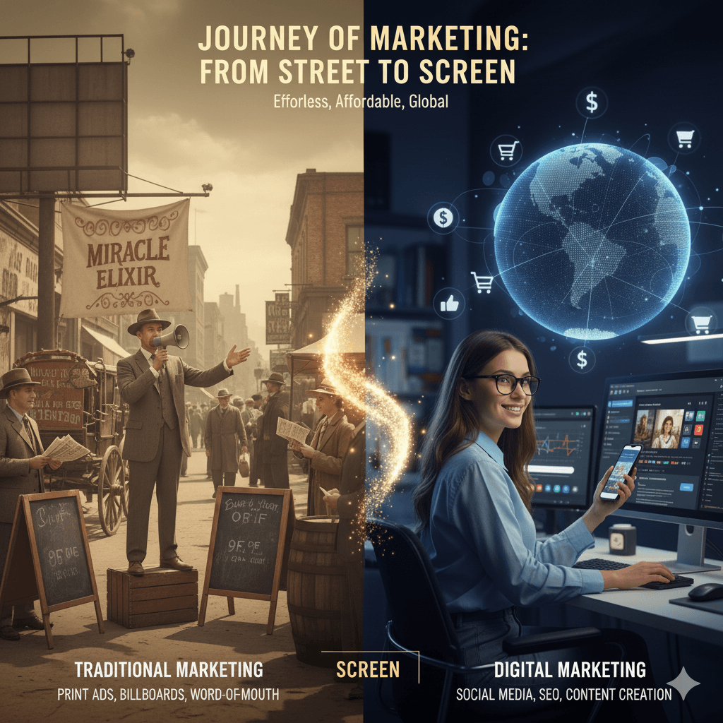 Discover the evolution of marketing from traditional ads like posters and T.V to modern digital marketing strategies. Le...